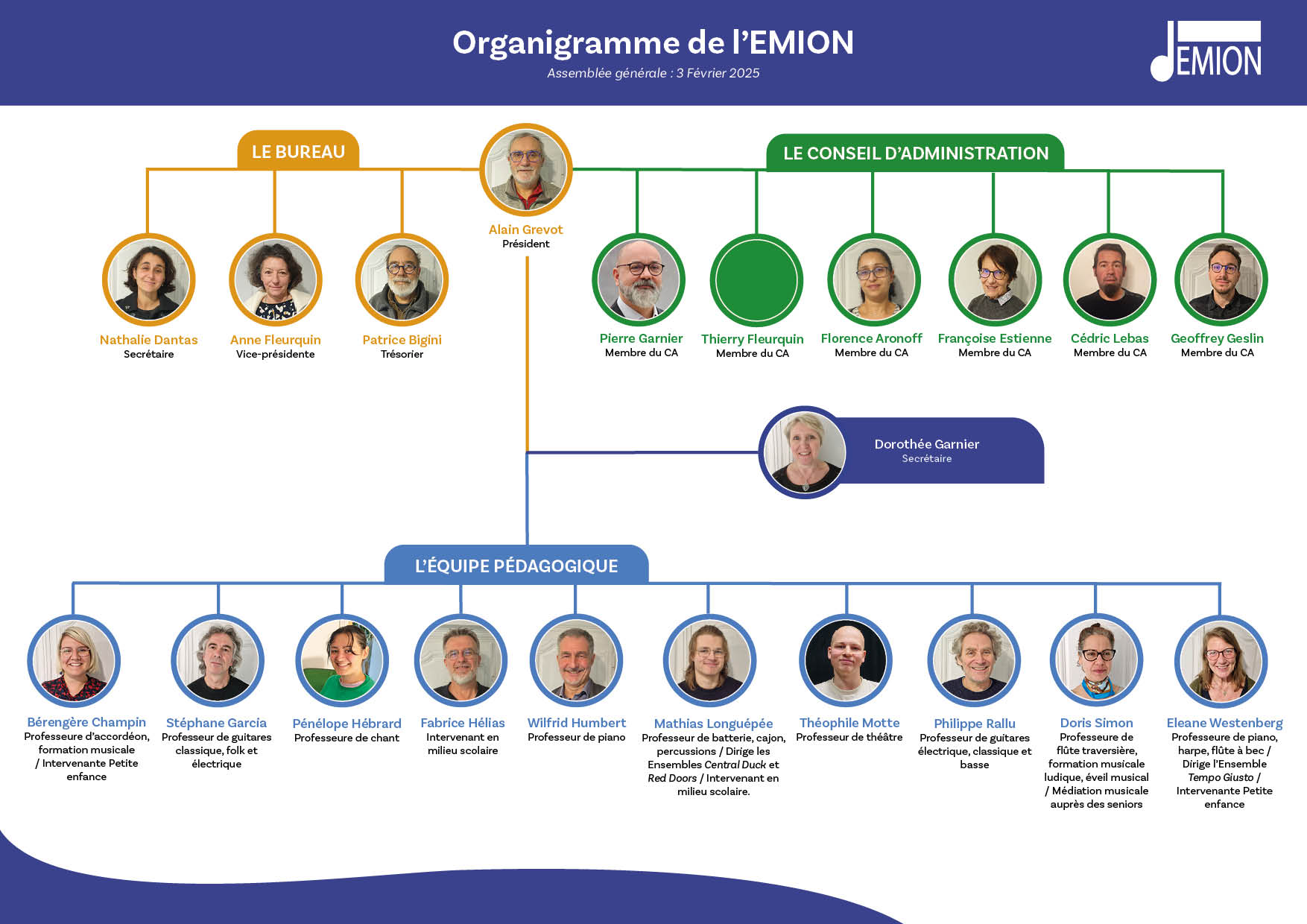 – d’une équipe de 8 professeurs de musique : Eleane WESTENBERG (Piano, Flûte à bec, Harpe, Ensemble Musical « Tempo Giusto », intervenante Petite enfance), Philippe RALLU (Guitare classique, Guitare électrique, Guitare basse), Mathias LONGUÉPÉE (Batterie, Cajon, Percussions, Ensembles « Red Doors » et « Central Duck », intervenant en milieu scolaire), Doris SIMON (Flûte Traversière, Formation Musicale Ludique, Éveil Musical, médiation musicale auprès des seniors), Stéphane GARCIA (Guitare classique, Guitare Folk, Guitare électrique), Bérengère CHAMPIN (Accordéon, Formation Musicale, intervenante Petite enfance), Fabrice HELIAS (Intervenant en milieu scolaire), Wilfrid HUMBERT (Piano),