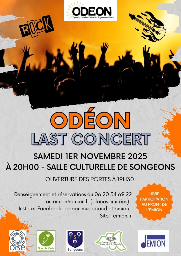 ODEON, un groupe de reprises Pop/Rock formé au sein de l’EMION, aura le plaisir de donner son dernier concert, après sept années de belles aventures ! Nous vous attendons nombreux le 1er novembre 2025 à 20h à la Salle culturelle de Songeons pour partager une soirée festive !